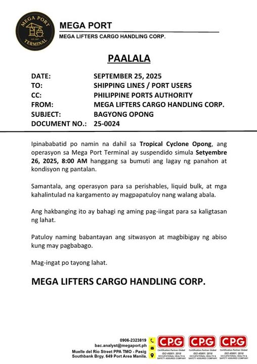 Mega Lifters Cargo Handling Corp (MLCHC) announced today the temporary suspension of its cargo handling operations at the Port of Pasig, effective at 8:00 AM on Friday, September 26, 2025. This preemptive measure is being taken to ensure the safety and security of port personnel, assets, and facilities in anticipation of the landfall of Tropical Cyclone Opong.