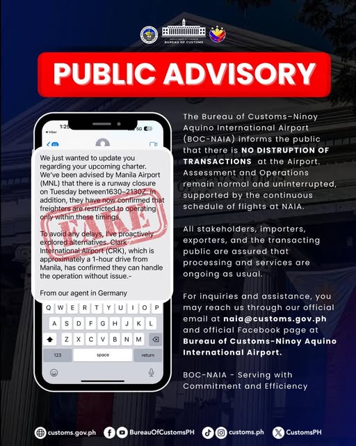 Despite any circulating rumors or misinformation, BOC-NAIA confirms that all essential functions—including assessment, clearance, and operational activities—are proceeding normally and uninterrupted. This continued efficiency is fully supported by the regular and ongoing schedule of flights at the Ninoy Aquino International Airport (NAIA).