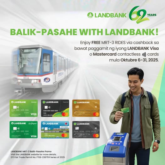 From October 6 to October 31, 2025, commuters who use their eligible LANDBANK cards to tap into the Metro Rail Transit Line 3 (MRT-3) will effectively get their return-fare ride for free via an automatic cashback.