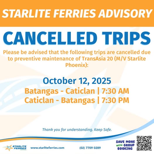 TransAsia Shipping Lines, Inc., today announced the temporary cancellation of two trips for its vessel, M/V Starlite Phoenix (Voyage TransAsia 20), to facilitate essential preventive maintenance. This measure is a proactive step to ensure the continued safe and reliable service for all passengers.