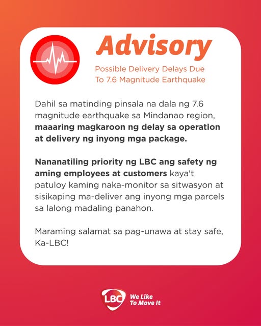 LBC Express, the leading Philippine courier, cargo, and money remittance service, today issued an advisory to its valued customers regarding potential delays in its operations and package deliveries across the Mindanao region following the powerful Magnitude 7.6 offshore earthquake.