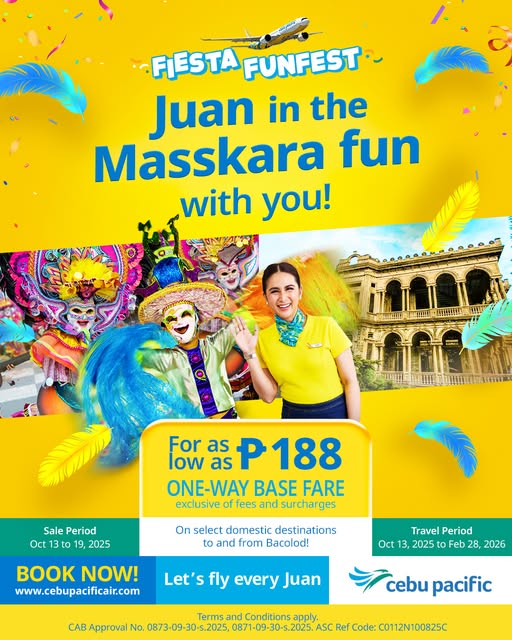 “We know that saving on the travel budget means more money for enjoying the festivities, shopping for souvenirs, or exploring new places,” said Candice Iyog, Vice President for Marketing and Customer Experience. “Our #CEBSeatSale is perfectly timed for those who want to attend the MassKara Festival and for anyone planning their holidays well into 2026. Book now and let’s make your travel dreams happen!”