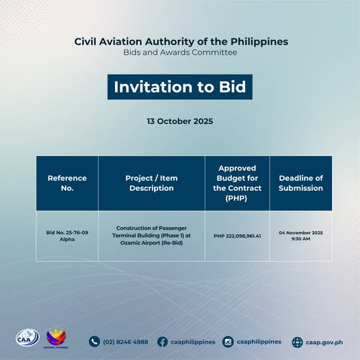 The Civil Aviation Authority of the Philippines (CAAP) has reissued an Invitation to Bid for the crucial Construction of the Passenger Terminal Building (Phase 1) at Ozamiz Airport, signaling a significant step forward in the modernization of air travel infrastructure in Northern Mindanao. The project, designated as Bid No. 25-76-09 Alpha (Re-Bid), aims to enhance the capacity and passenger experience at Ozamiz Airport, supporting economic growth and accessibility in the region.