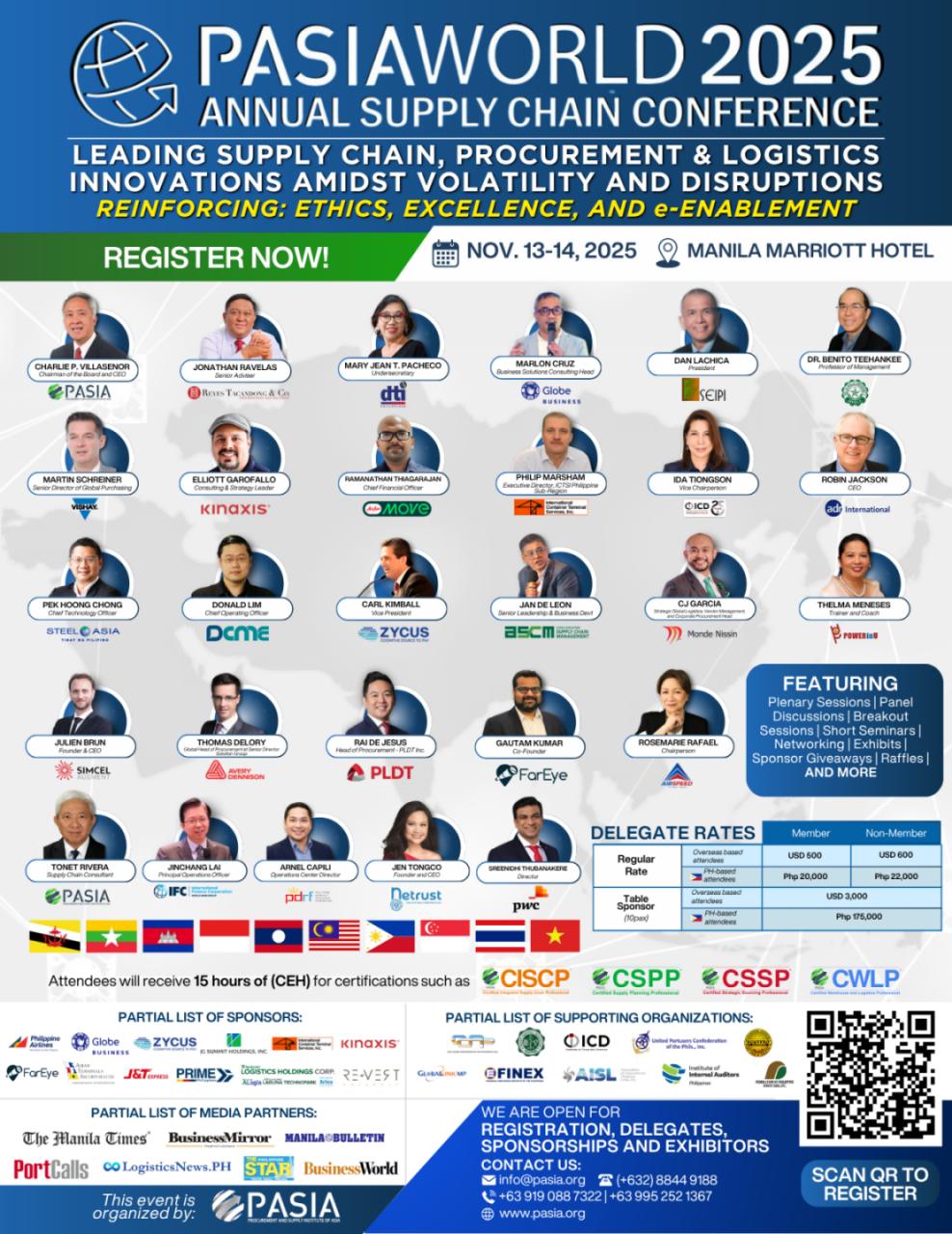The Procurement and Supply Chain Institute of Asia (PASIA) vowed to lead good governance in the procurement and supply chains at the upcoming PASIAWORLD 2025, Asia’s premier integrated conference on supply chain, procurement, and logistics, set for November 13–14, 2025, at the Manila Marriott Hotel.