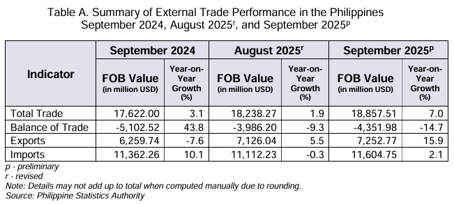 The country’s total external trade in goods recorded a strong annual increase of 7.0 percent in September 2025, reaching USD 18.86 billion, up from USD 17.62 billion in the same period last year. The latest data released by the Philippine Statistics Authority (PSA) highlights accelerating momentum in the trade sector, propelled by robust growth in foreign sales.