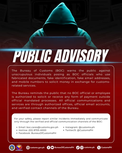 The Bureau of Customs (BOC) issued an urgent advisory, warning the public against a sophisticated scheme involving unscrupulous individuals who falsely represent themselves as BOC officials to fraudulently solicit money. These scammers exploit the need for customs-related services by employing fabricated documents, fake identification cards, bogus email addresses, and unverified mobile numbers to demand illegal payments.