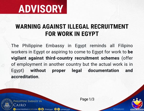 The Philippine Embassy in Egypt issued a crucial public advisory, urging all Overseas Filipino Workers (OFWs) currently in or intending to travel to Egypt for employment to be highly vigilant against illegal and deceptive “third-country” recruitment schemes.
