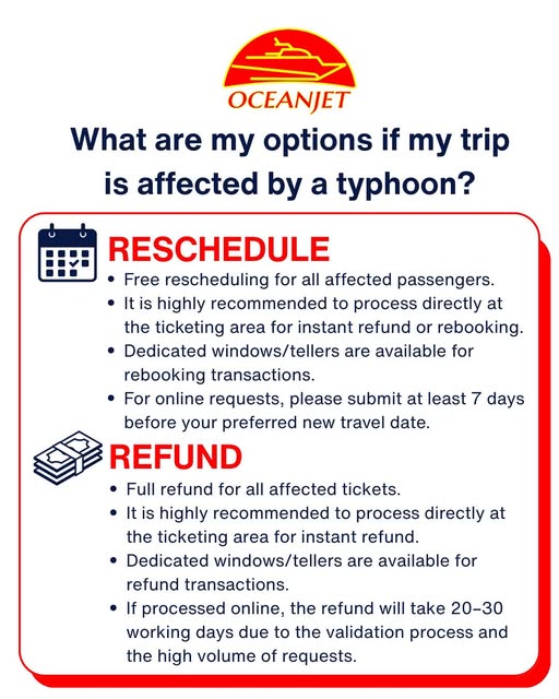 OceanJet today issued a travel advisory detailing flexible options for passengers whose voyages have been impacted by the recent typhoon. The company announced that all affected travelers are entitled to either a free reschedule or a full refund, prioritizing passenger safety and convenience during recovery efforts.