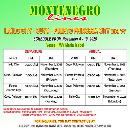 Montenegro Shipping Lines (MSL) announced the confirmed schedule and corresponding fare matrix for the MV Maria Isabel, servicing key routes connecting Iloilo City, Cuyo, and Puerto Princesa City from November 6 to November 10, 2025.