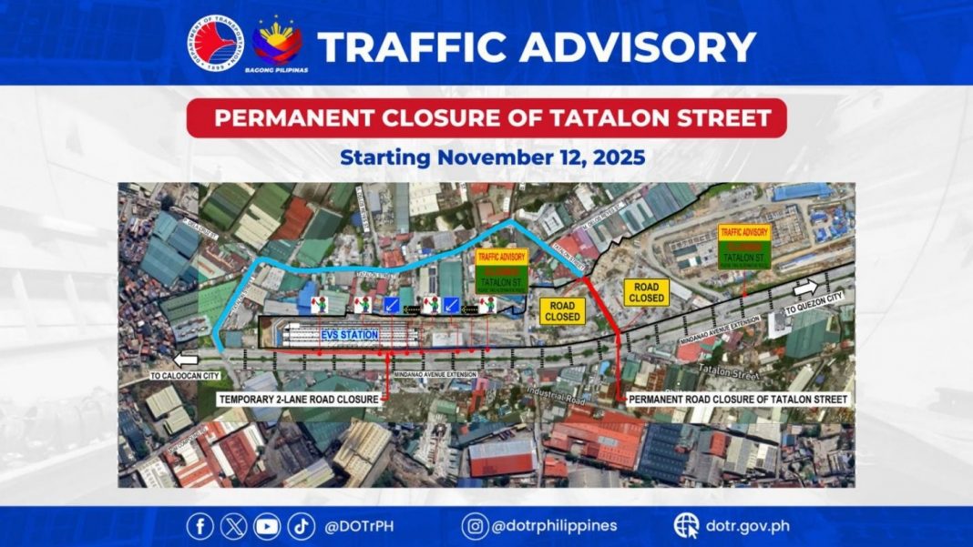 The Department of Transportation (DOTr) today announced the permanent closure of a section of Tatalon Street in Valenzuela City to both vehicular and pedestrian traffic, effective November 12, 2025. This critical measure is necessary to facilitate the construction of the main Metro Manila Subway Project (MMSP) Depot.