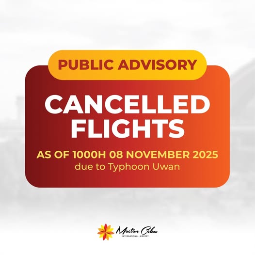 Mactan Cebu International Airport (MCIA) today issued an urgent public advisory announcing the cancellation of several domestic flights scheduled for Sunday, November 9, 2025, in anticipation of the severe weather conditions brought by Typhoon #UwanPH.