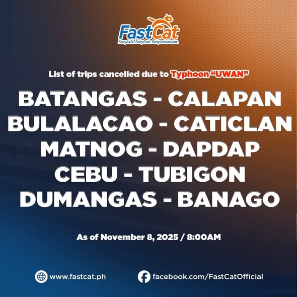 FastCat today announced the temporary cancellation of several scheduled ferry trips across various routes, effective immediately, in response to the severe weather conditions and rough seas brought by Severe Tropical Storm “Uwan.”