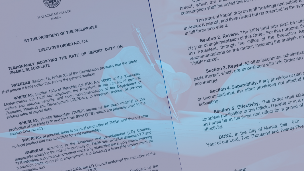 President Ferdinand R. Marcos Jr. has signed Executive Order (EO) No. 104, implementing a temporary reduction of the import duty on tin-mill blackplate (TMBP). This measure is designed to immediately stabilize the supply chain for the country’s canned food industry and provide relief by lowering production costs.