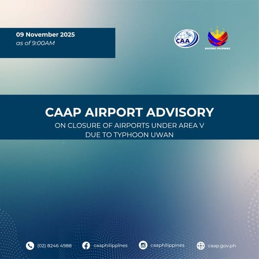The Civil Aviation Authority of the Philippines (CAAP) today announced the temporary suspension of all airport operations across its Area V jurisdiction, primarily covering the Bicol region, due to the severe and ongoing impact of Typhoon “Uwan.”
