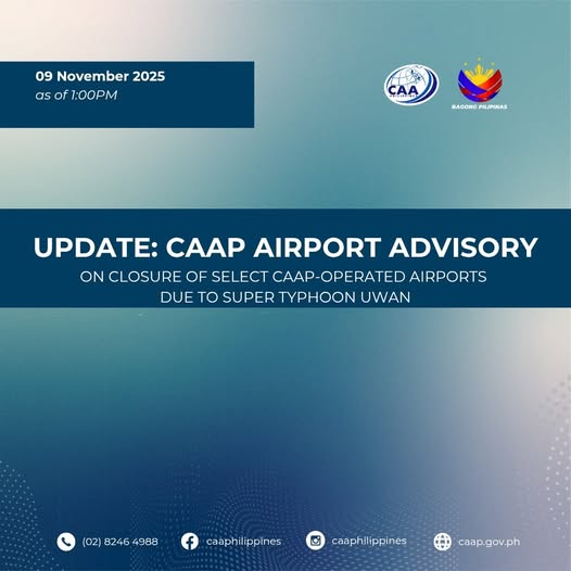 The Civil Aviation Authority of the Philippines (CAAP) has issued a new advisory announcing additional temporary closures of several airports as Super Typhoon Uwan continues its path, bringing adverse weather conditions across various parts of the country .