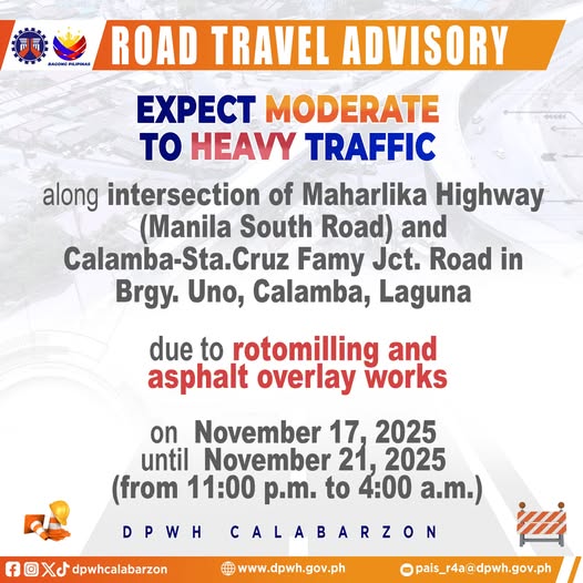 The Department of Public Works and Highways (DPWH) Regional Office IV-A is issuing a public advisory regarding scheduled road rehabilitation works that will affect traffic flow at a critical intersection in Calamba City, Laguna.