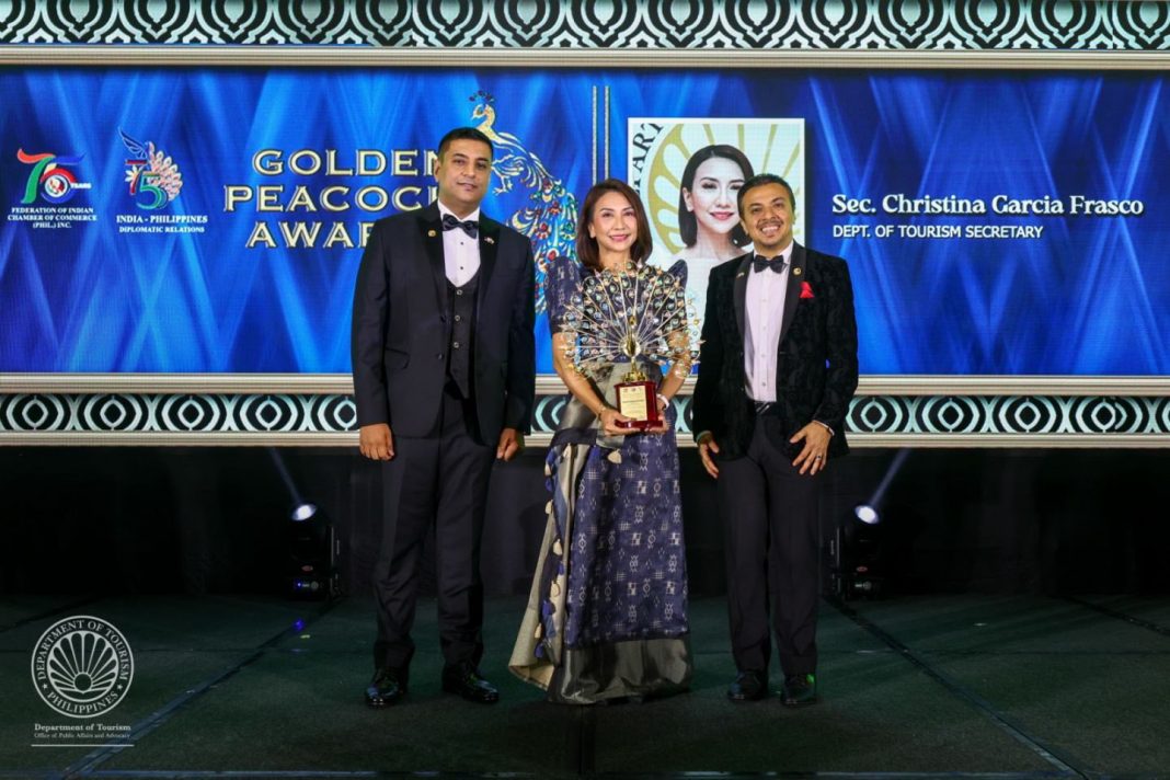Department of Tourism (DOT) Secretary Christina Garcia Frasco was honored with the prestigious Golden Peacock Excellence in Government Service Award 2025 on Wednesday (November 19) during the Thanksgiving Night celebration of the 75th Anniversary of India–Philippines Diplomatic Relations.