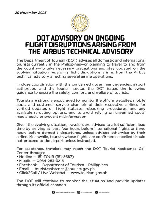The Department of Tourism (DOT) today advised all domestic and international tourists in the Philippines, or those planning travel to and from the country, to take necessary precautions and remain updated on the evolving situation regarding flight disruptions. These disruptions stem from a global Airbus technical advisory requiring mandatory software updates for certain A320 family aircraft, which has impacted the operations of several airlines, including Philippine carriers.