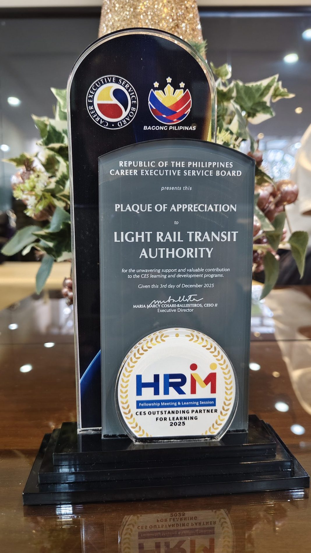 The Light Rail Transit Authority (LRTA) proudly announces its receipt of the prestigious Plaque of Appreciation from the Career Executive Service Board (CESB), recognizing the Authority as an Outstanding Partner for Learning 2025.