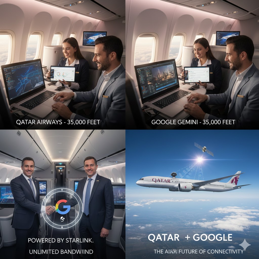 Qatar Airways, in partnership with Google, announced the successful execution of an unprecedented demonstration that redefines the future of connectivity and productivity at 35,000 feet. The airline became the first to successfully generate, edit, and publish AI-created commercial videos end-to-end during a flight, powered by Starlink’s high-speed, low-latency satellite connectivity.