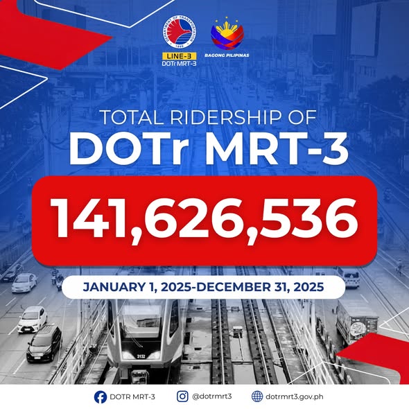The Department of Transportation Metro Rail Transit Line 3 (DOTr-MRT3) officially announced today a significant milestone in public service, recording a total of 141,626,536 passengers for the year 2025.