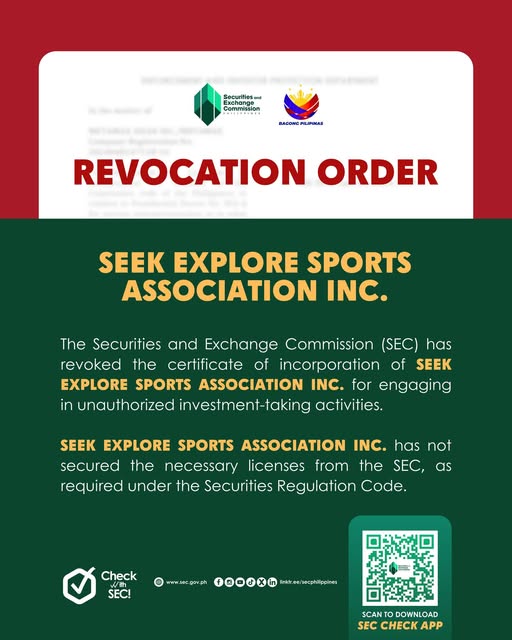 In an order issued by the Enforcement and Investor Protection Department (EIPD), the Commission cancelled Seek Explore’s corporate registration and imposed an administrative fine of P1 million for serious violations of the Revised Corporation Code (RCC) and the Securities Regulation Code (SRC).
