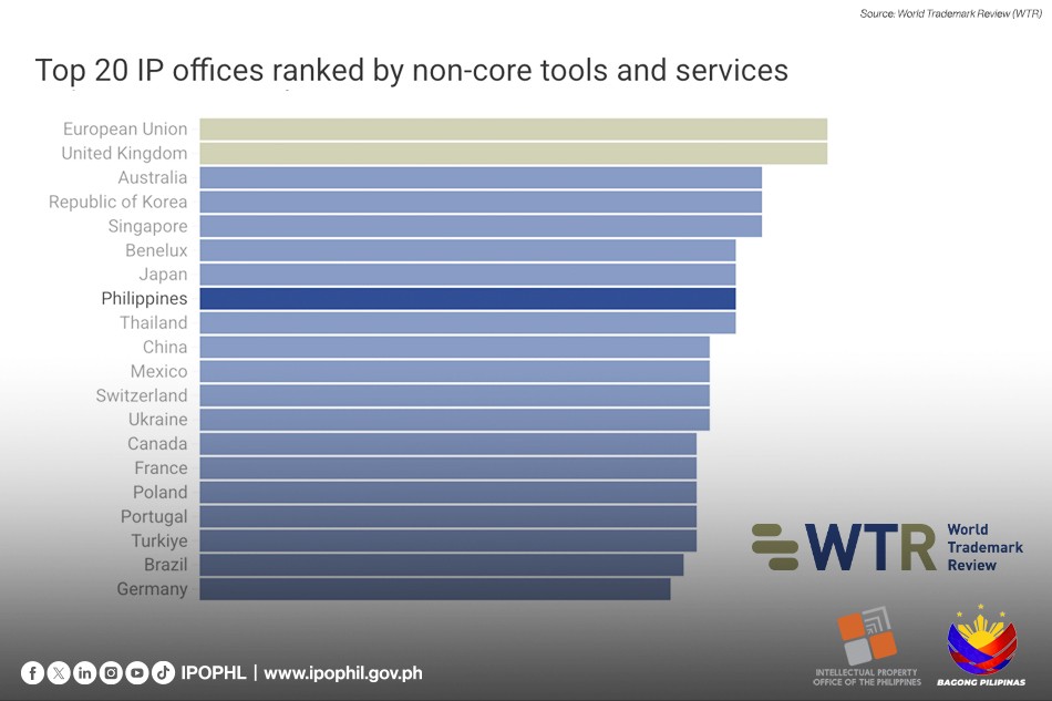 Based on the World Trademark Review’s (WTR) 2026 IP Office Innovation Ranking, IPOPHL tied with the IP offices of Benelux, Japan and Thailand. Together, they trailed behind the IP offices of the European Union and the United Kingdom, which tied for first place, and Australia, the Republic of Korea and Singapore, which landed second place.
