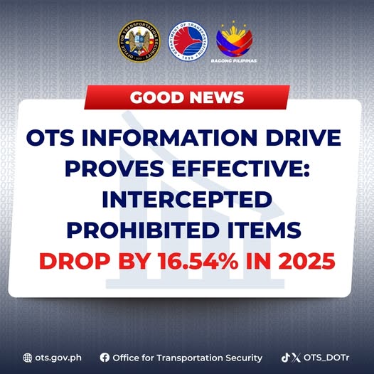OTS Administrator, Undersecretary Gilberto DC Cruz, emphasized that informed passengers are the agency’s best partners in maintaining safety. “Our massive information drive campaigns, together with continuous security refresher trainings and strengthened airport security measures, have clearly delivered positive results,” said Usec. Cruz. “We are seeing a clear decrease in prohibited items being brought to airports, which is a result of correct information and a higher level of awareness among our passengers. Every campaign and training session serves as a reminder that collective action and proper knowledge are keys to a safer and smoother journey for all.”