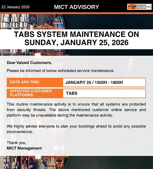 International Container Terminal Services, Inc. (ICTSI) has issued a public advisory regarding scheduled system maintenance for the Terminal Appointment Booking System (TABS) at the Manila International Container Terminal (MICT).