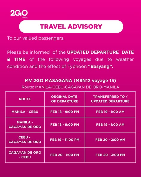 To ensure the safety of all passengers and crew, 2GO Travel has announced updated departure schedules for several voyages due to the adverse weather conditions caused by Typhoon “Basyang.”