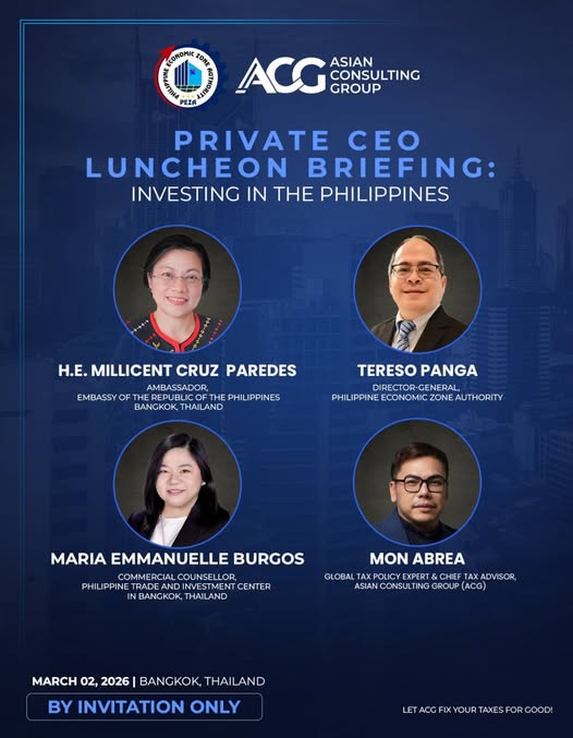 The exclusive, invitation-only event is hosted by the Asian Consulting Group (ACG), one of PEZA’s official Investment Promotion Partners. The briefing aims to strengthen bilateral economic ties and position the Philippines as a primary destination for Thai enterprises looking to expand within the ASEAN region.