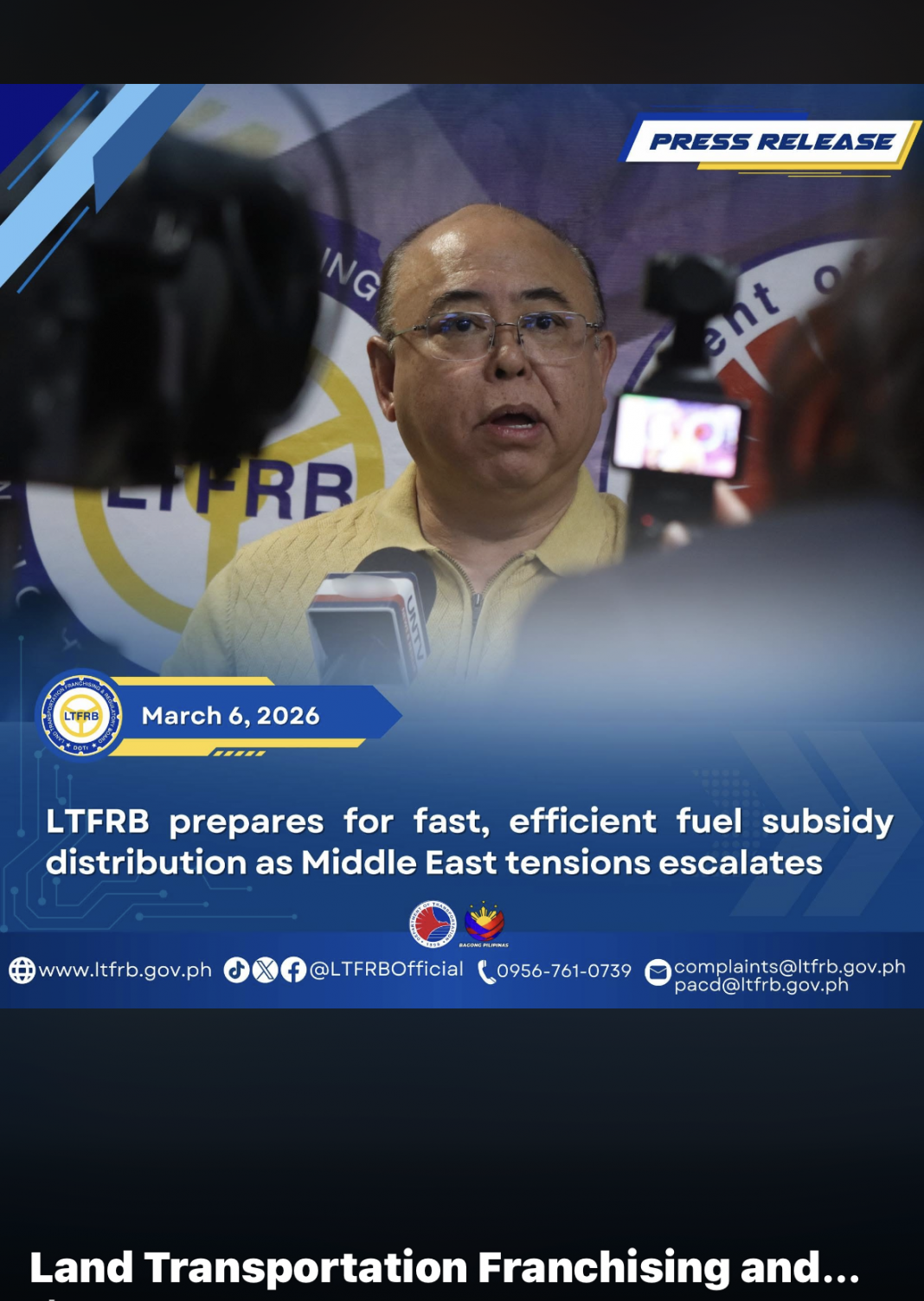 LTFRB Chairperson Atty. Vigor D. Mendoza the preparation in response to the directive of Transportation Secretary Giovanni “Banoy” Z. Lopez, who earlier said that the national government has earmarked around PHP2.5 billion for fuel subsidy of all those in the public transportation sector. This is in line with the instruction of President Ferdinand “Bongbong” R. Marcos, Jr. to ensure maximum assistance to drivers and operators amid the escalating tensions in the Middle East.