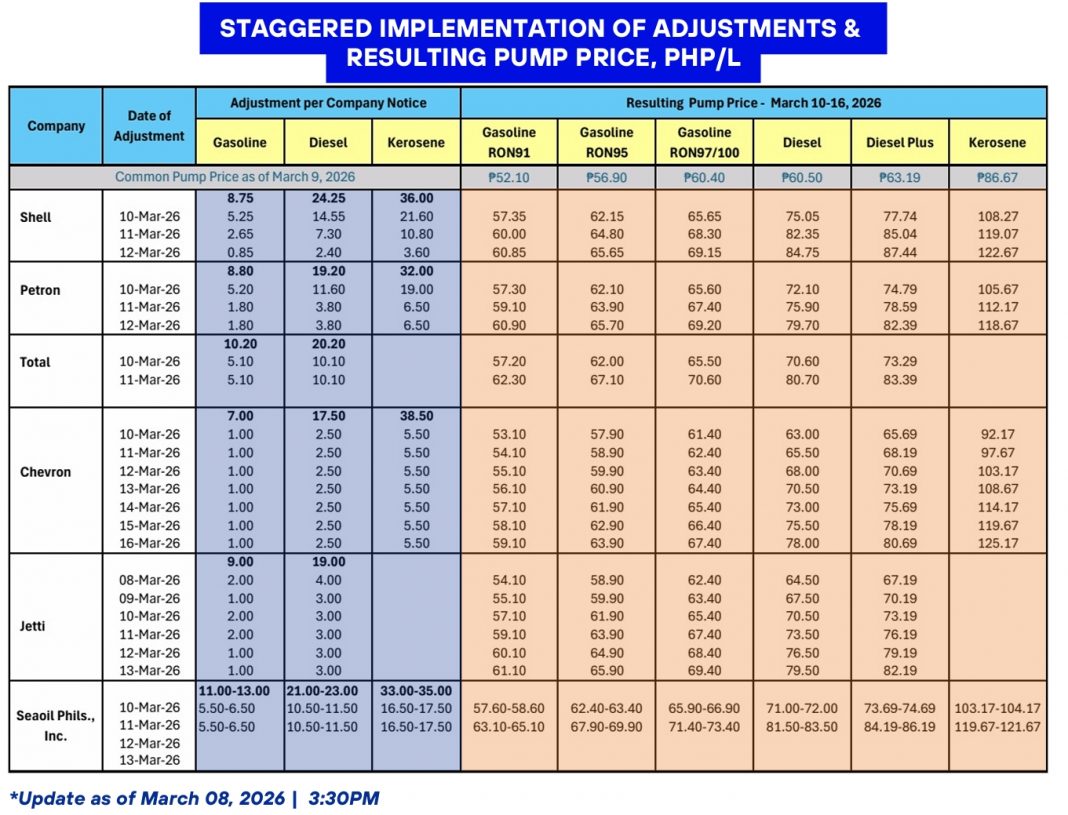 The Department of Energy (DOE) announced that several oil companies have agreed to implement staggered pump price adjustments for petroleum products beginning Tuesday, March 10, 2026.