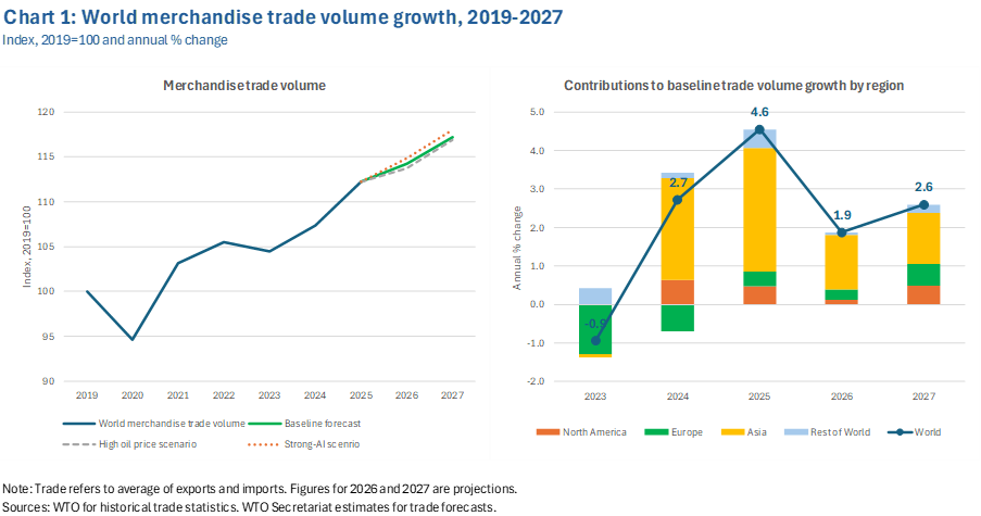 WTO economists note there is also some upside potential if the conflict is short-lived and if AI-related spending remains strong throughout 2026 and into 2027, in which case merchandise trade growth could be boosted by 0.5 percentage points leading to growth as high as 2.4 percent this year and 2.7 percent next year.