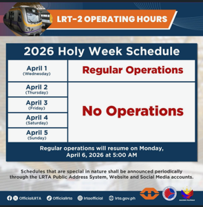 There will be no operation for LRT-2 on April 2 to April 5, 2026 in observance of the Holy Week celebration, the Light Rail Transit Authority (LRTA) announced. Regular operations will resume on April 6, 2026.