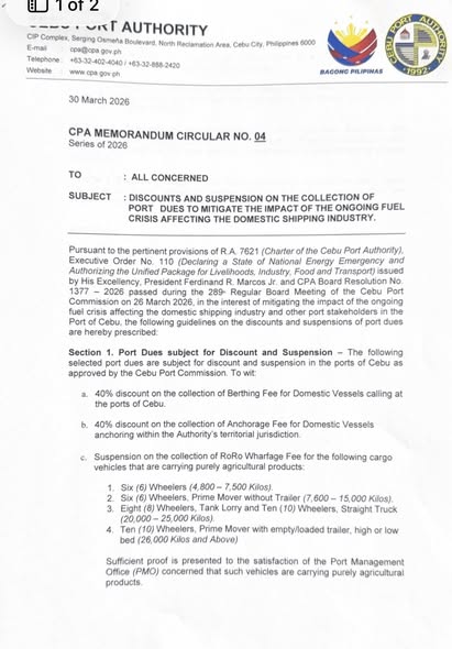 The Cebu Port Commission, during its meeting on 26 March 2026, has approved Cebu Port Authority (CPA) Memorandum Circular No. 4 series of 2026 to implement discounts, suspension of port charges, and passenger terminal fees for a duration of two months effective April 18, 2026 to mitigate the impact of fuel crisis to the riding public and shipping operators.