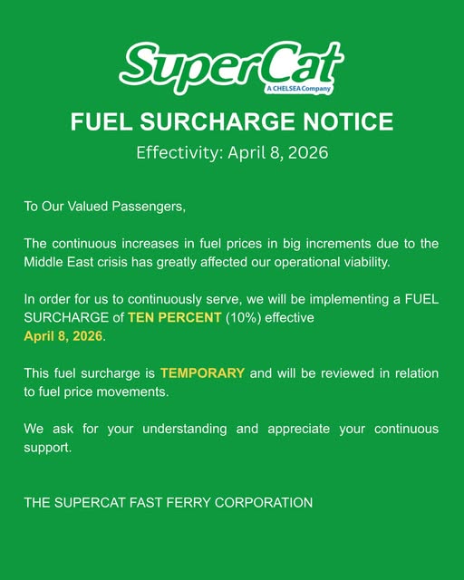 To ensure the operational viability of its fleet and to continue providing the safe, fast, and reliable sea travel that passengers expect, SuperCat will apply a ten percent (10%) fuel surcharge to all ticket categories.