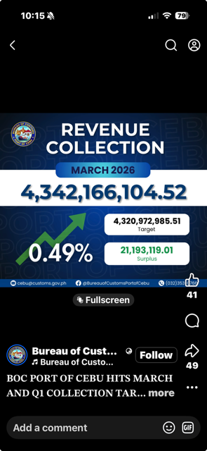 The Bureau of Customs (BOC) Port of Cebu maintained its upward momentum in March 2026, exceeding its assigned monthly target based on preliminary data. The Port collected a total of PHP4,342,166,104.52, surpassing PHP4,320,972,985.51 target.