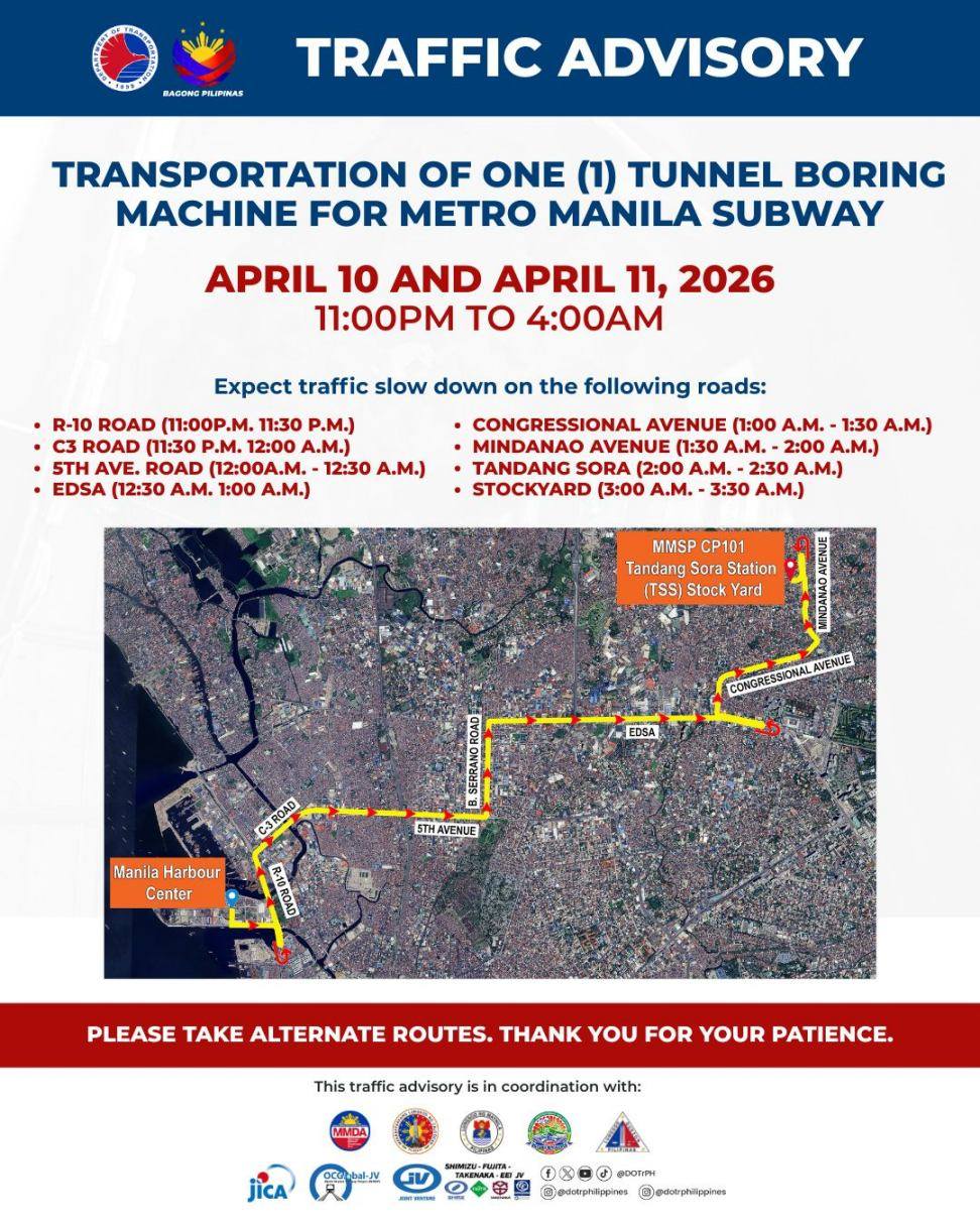 The Department of Transportation (DOTr) has advised the public of temporary traffic slowdowns along selected roads in Metro Manila from April 10 to April 13, 2026, between 11:00 PM and 4:00 AM, to give way to the safe transport of a major component of the Metro Manila Subway Project (MMSP).