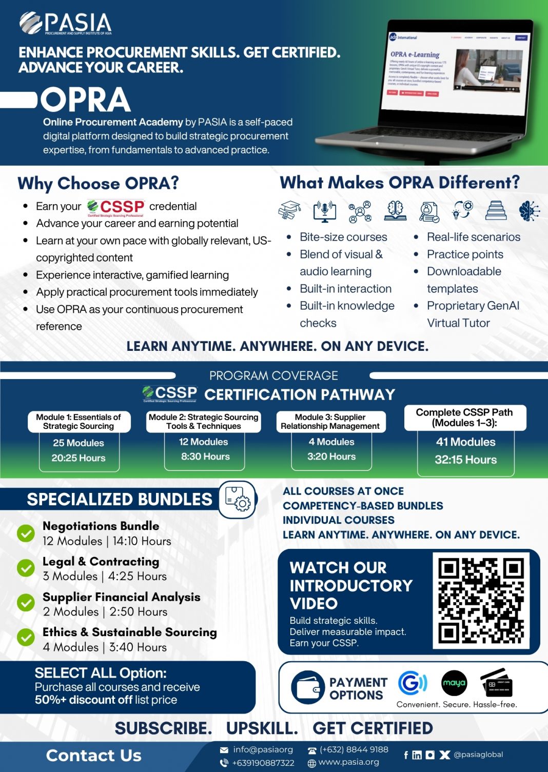 Manila, Philippines — Procurement professionals can now enhance their skills, get certified, and advance their careers through a seamless digital experience—similar to subscription-based platforms, easy to access and learn. The Procurement and Supply Institute of Asia has officially launched OPRA E-Learning (Online Procurement Academy) B2C model, a self-paced digital platform designed to build strategic procurement expertise from fundamentals to advanced practice. OPRA is now available across ASEAN and globally, enabling professionals everywhere to access world-class procurement training.