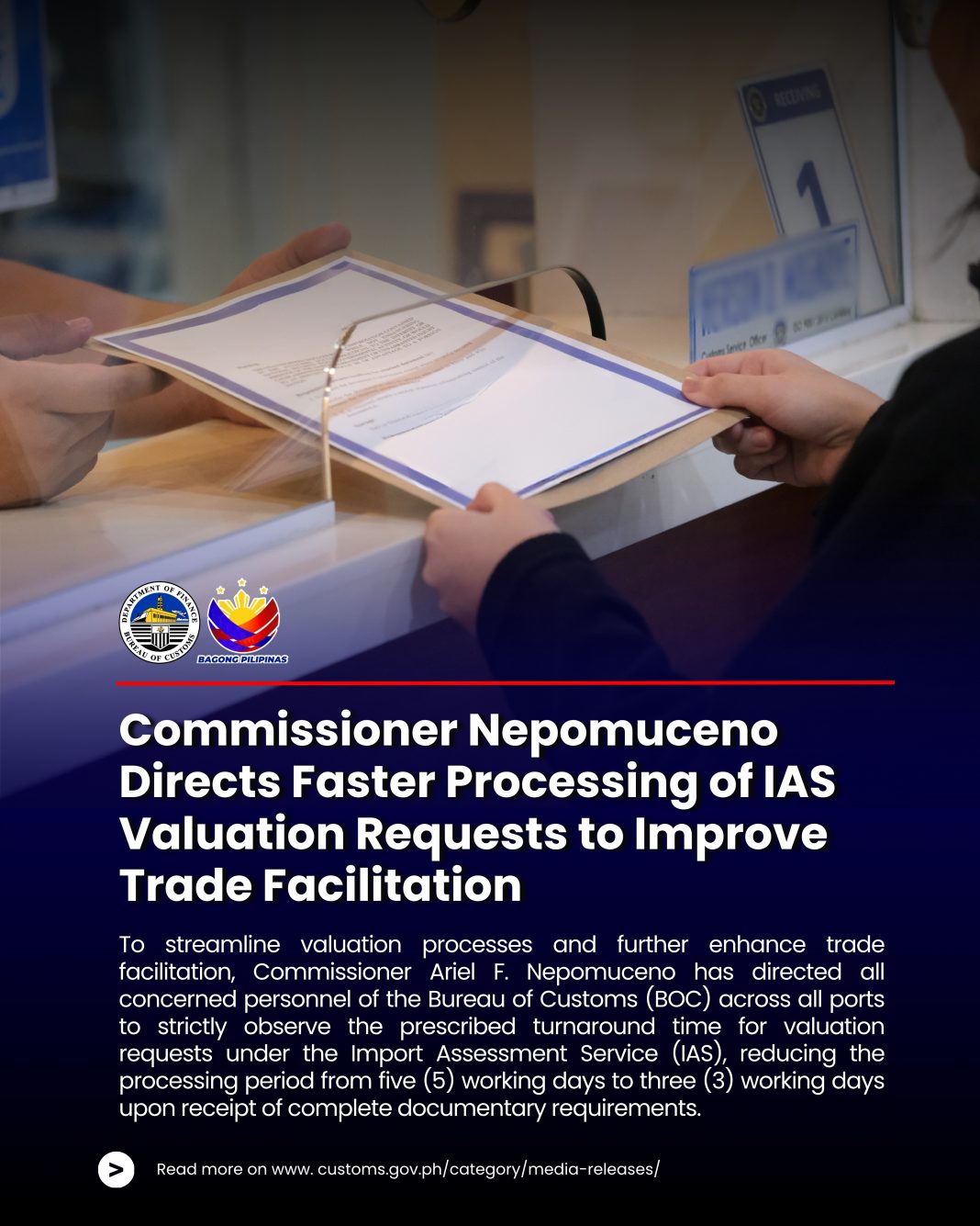 To streamline valuation processes and further enhance trade facilitation, Commissioner Ariel F. Nepomuceno has directed all concerned personnel of the Bureau of Customs (BOC) across all ports to strictly observe the prescribed turnaround time for valuation requests under the Import Assessment Service (IAS), reducing the processing period from five (5) working days to three (3) working days upon receipt of complete documentary requirements.