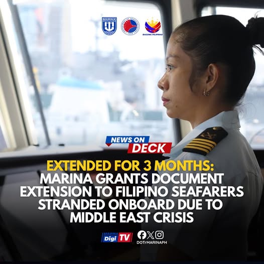 The Maritime Industry Authority (MARINA) has granted a 3-month extension on expired or soon-to-expire Seafarer’s Record Books (SRBs), Seafarer’s Identification and Record Books (SIRBs), and Seafarer’s Identity Documents (SIDs) for Filipino seafarers who remain onboard vessels affected by the escalating security situation in the Middle East and are unable to disembark due to disrupted crew change operations.